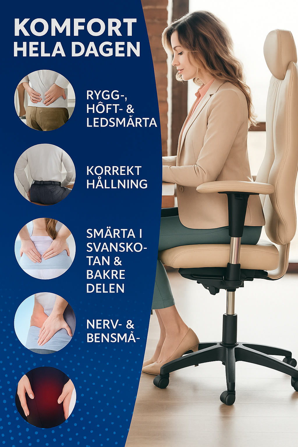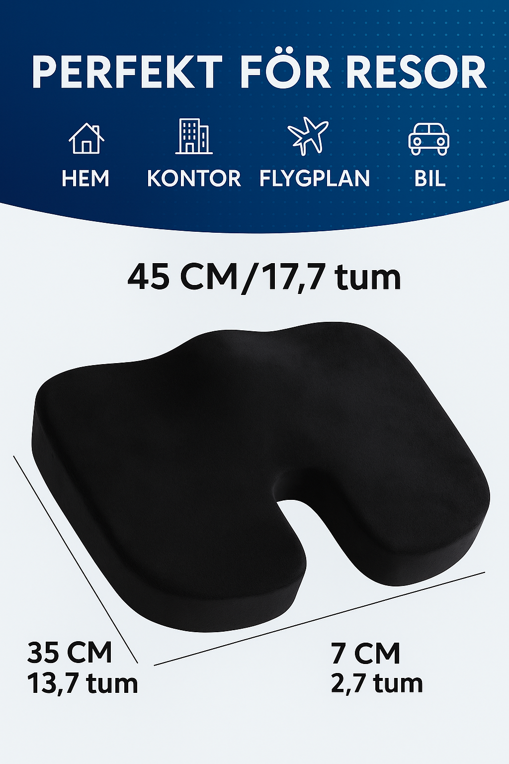 Upplev en ny nivå av sittkomfort med denna ergonomiskt designade sittkudde. Kudden är formad för att avlasta trycket på svanskotan (coccyx), minska belastning på rygg och höfter samt förbättra din hållning – perfekt för dig som sitter länge på kontor, i bil eller hemma.